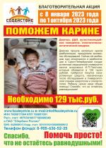 Акция с 01 сентября по 31 октября 2012 года. Акция завершена, собрано 80517,25 рублей, уже оплачено лечение в Московском реабилитационном центре на сумму 80550 рублей.